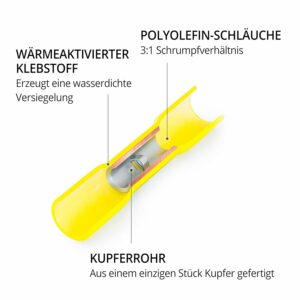 Der einfachste und sicherste Weg, um Litzenkabel zu verbinden ist ein Schrumpfverbinder*. Ihr legt das Kabel in das Formstück, benutzt die Crimpzange zur Befestigung und haltet ein Feuerzeug oder eine Heißluftpistole* an die offenen Enden. Der wärmereaktive Klebstoff zieht sich zusammen und versiegelt die Anschlussstelle. Diese Verbindungen sind sehr stabil, zug- und wasserfest und eignen sich hervorragend für den Innenausbau im Camper.