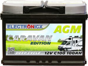 AGM ("Absorbent Glass Mat") steht für Batterien mit einer Glasfasermatte, welche die Elektrolyten binden und eine Säureumschichtung verhindern. Im Vergleich zur klassischen Bleibatterie sind sie wartungsärmer und die geschlossene Bauform bietet mehr Schutz. Die Kosten sind hier etwas höher als bei einer reinen Blei-Säure-Batterie.