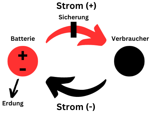 Auf der folgenden Abbildung könnt ihr - vereinfacht dargestellt - einen Stromkreislauf mit einer Batterie erkennen. Vom Pluspol eurer Batterie fließt der Strom zu den Verbrauchern (z.B. Kühlschrank, Herdplatte, Lampen, etc.) und von dort zurück zum Minuspol eurer Batterie. Mit diesem Lückenschluss habt ihr einen geschlossener Stromkreislauf.