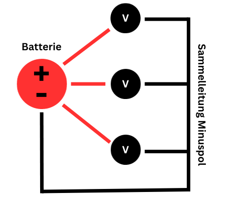 In der Regel werdet ihr mehrere Verbraucher haben und euer Stromkreislauf wird wie auf dem folgenden Bild aussehen. Hier laufen mehrere Plusleitungen zu den Verbrauchern und eine gebündelte Minusleitung zurück zu eurer Batterie.