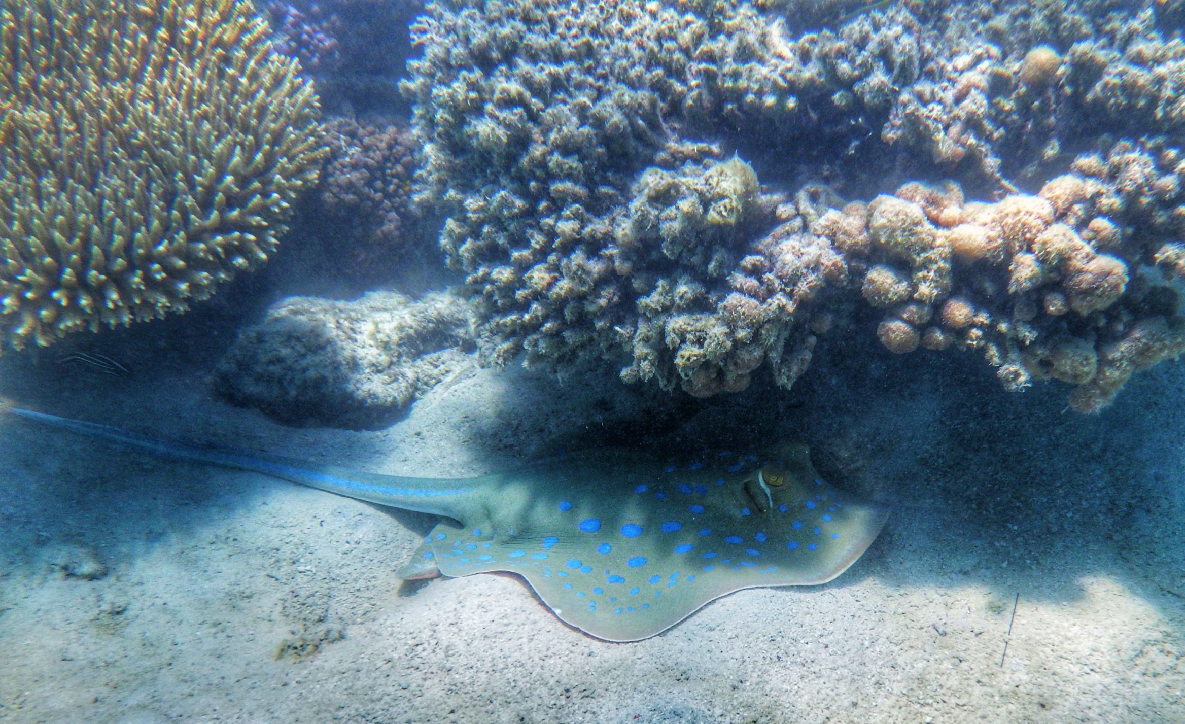 Nach etwa 1,5 Stunden Badespaß wurden wir zum Schnorcheln zusammengetrommelt. Die notwendige Ausrüstung haben wir vor Ort erhalten, diese ist im Preis mit inbegriffen gewesen. Wir haben unsere eigenen Masken mit auf den Ausflug genommen und uns lediglich Schwimmflossen ausgeliehen, um schneller voran zu kommen. Das Boot hat uns zu einem nahgelegenen Riff gebracht, an dem wir viele Fische und Rochen beobachten konnten.