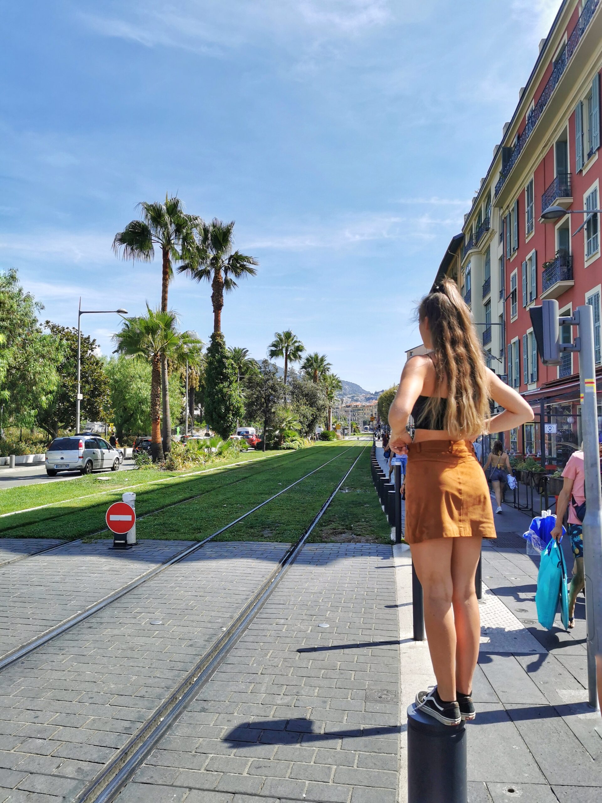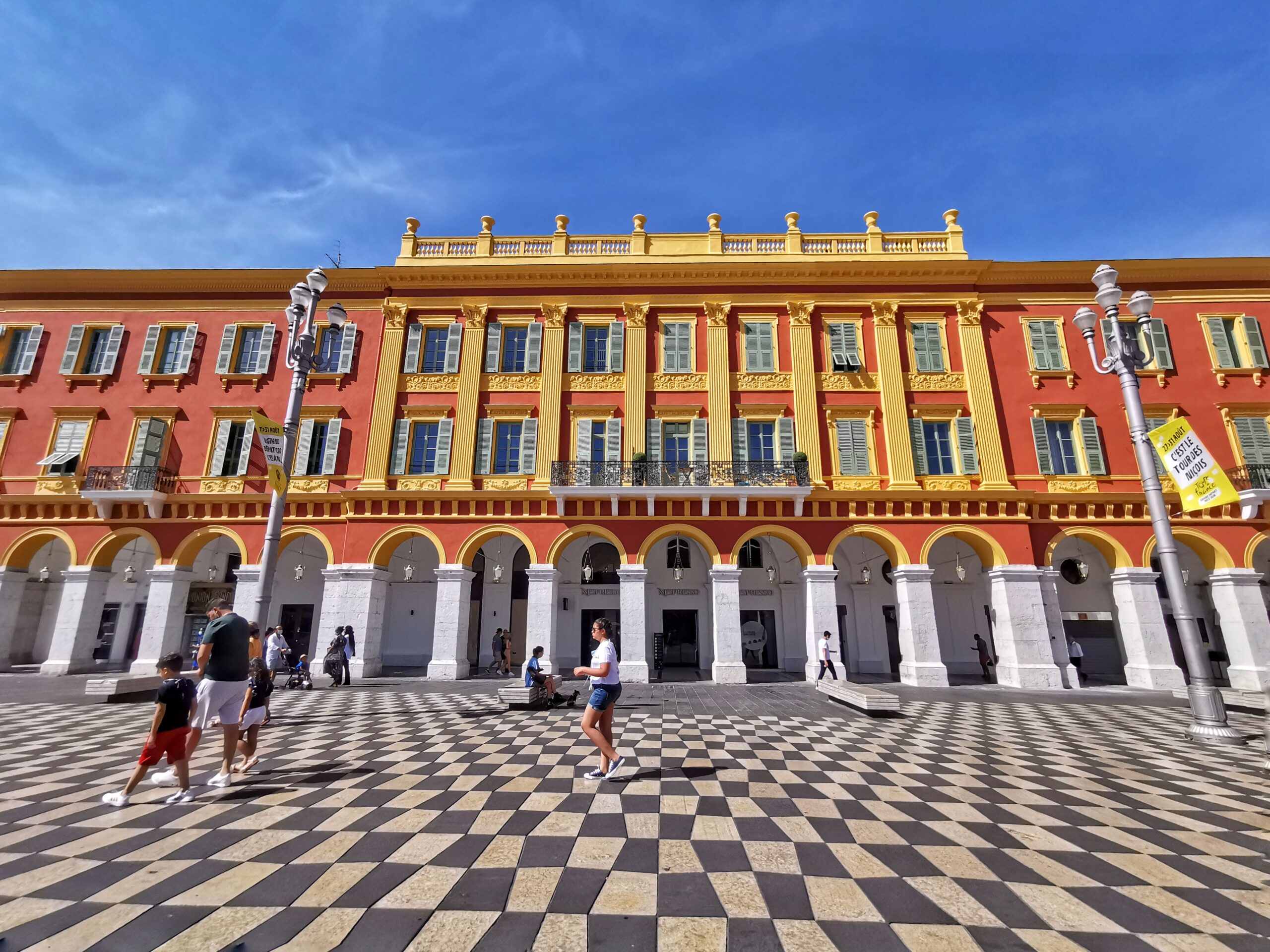 Zu Fuß sind wir zum Place Massena gegangen. Der prächtige Platz aus dem 19. Jahrhundert begeistert vor allem durch seinen symmetrischen Aufbau und die schwarz-weißen Pflastersteine, die das Stadtbild lebendig gestalten. Am Ende des Platzes steht die berühmte Bronzestatue des griechischen Gottes Apollo: Die Fontaine du Soleil.
