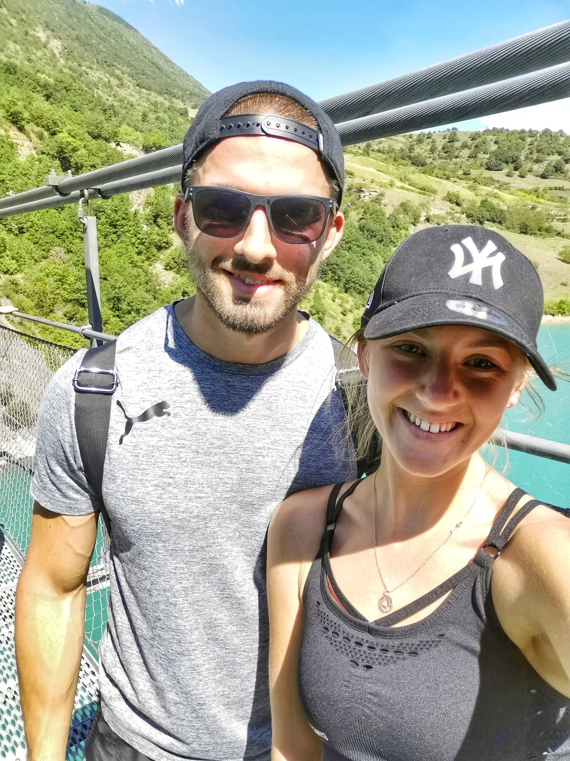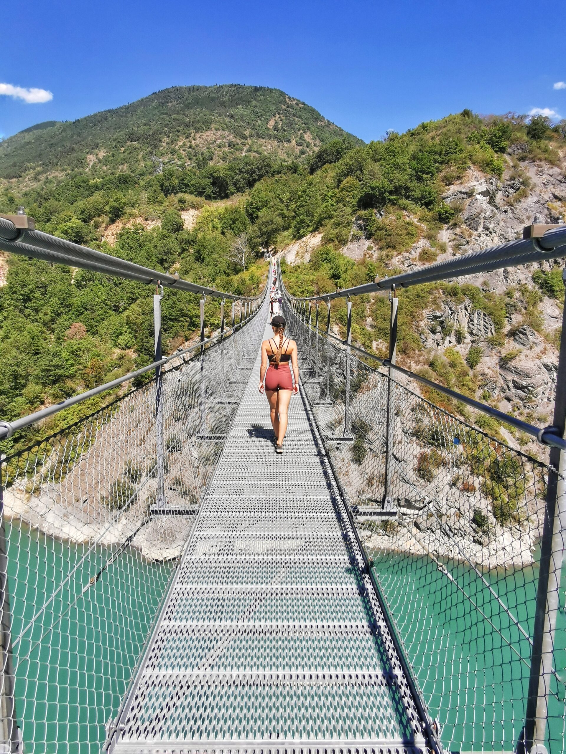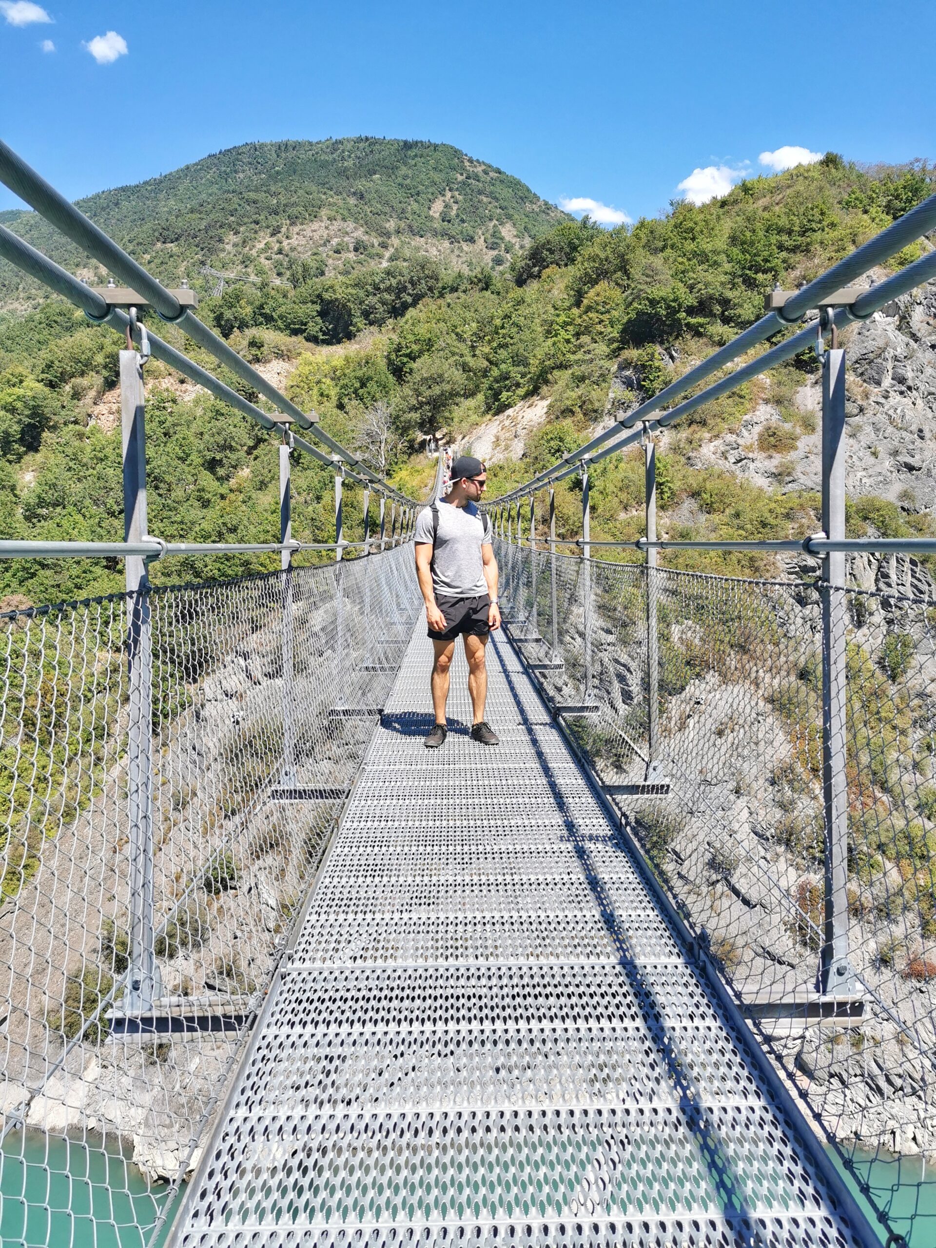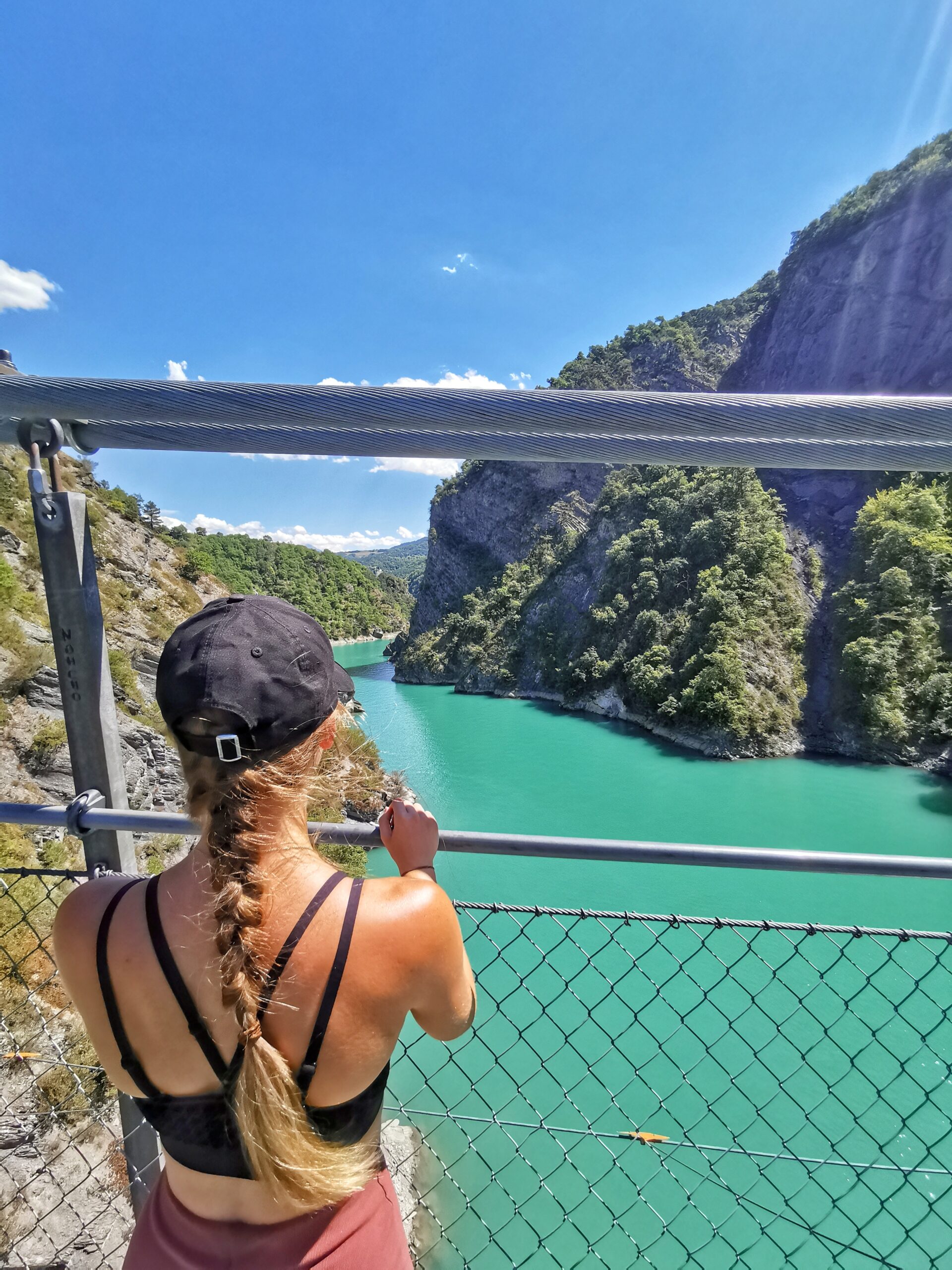 Für schöne Fotos haben wir etwas länger gewartet, da es sehr schwer gewesen ist, dass auf der ganzen Länge der Fußgängerbrücke keine Menschen gehen/stehen. Hat dann aber doch ganz gut funktioniert 😉 Von der Mitte aus habt ihr übrigens einen Panoramablick über den Fluss Drac, dessen türkisblaues Wasser sich wie eine bunte Schlange durch die Landschaft zieht.