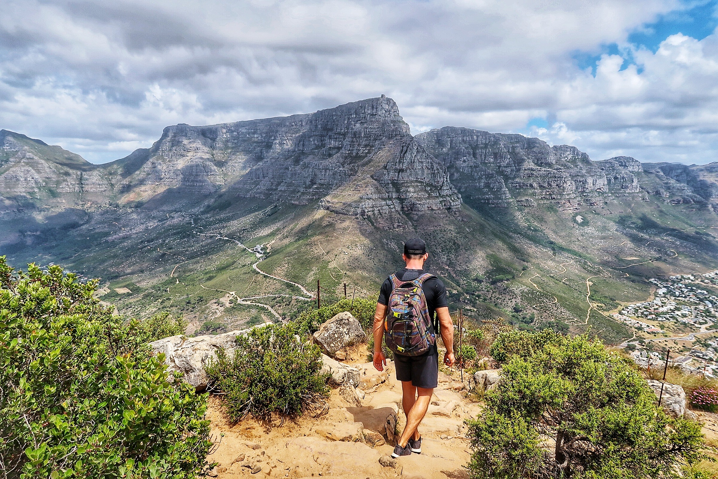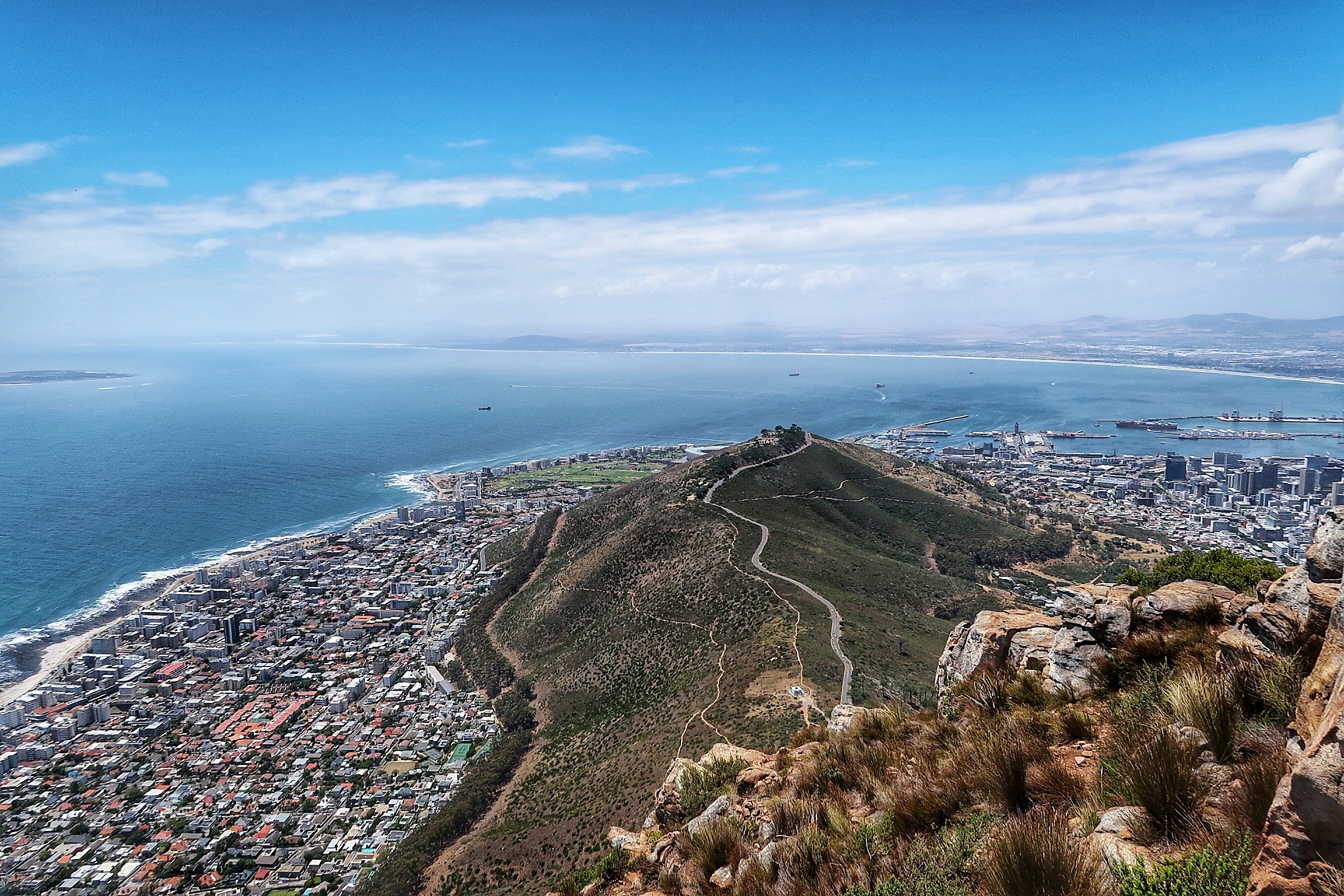 Wir haben unsere Tour um ca. 08:00 Uhr vom Gipfel des Signal Hill begonnen und sind voller Energie los gestartet. Unseren Mietwagen haben wir übrigens kostenlos auf einem Parkplatz am Signal Hill abstellen können. Von dort aus führt ein Wanderweg auf dem Bergkamm direkt in Richtung Lions Head von dem aus ihr einen tollen Ausblick auf den Tafelberg, die sogenannte City Bowl und Sea Point habt.