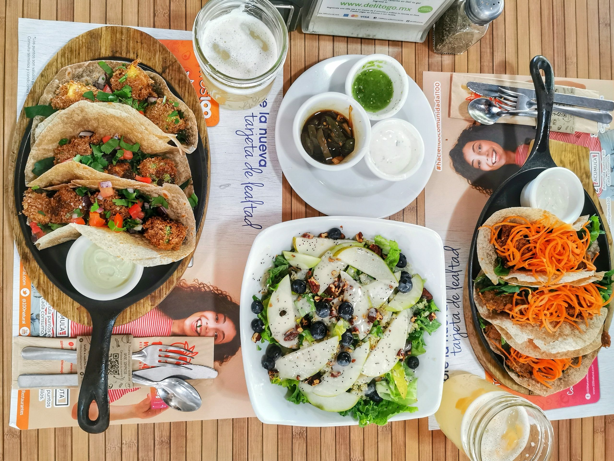 Vom 100% Natural sind wir so begeistert gewesen, dass wir gleich zwei Mal dort waren: Einmal in Cancun und das zweite Mal in Playa del Carmen. Das Personal hat uns herzlich empfangen und uns bereits von der gegenüberliegenden Straßenseite freundlich ins Restaurant gewunken. Ich wollte noch ein Foto machen, da hat mich Michael glatt vergessen und ist hungrig in Richtung des aufmerksamen Kellner gesprintet. Auf der Speisekarte findet ihr vegane, vegetarische und glutenfreie Gerichte.