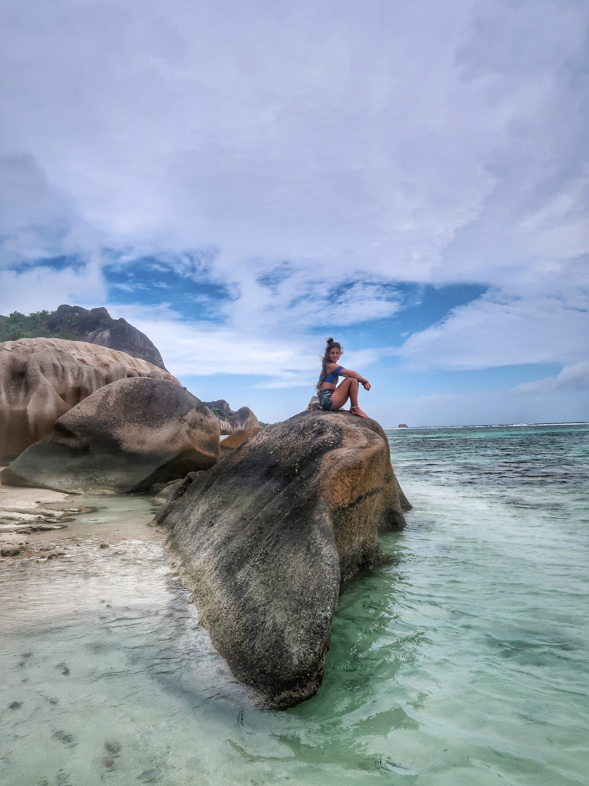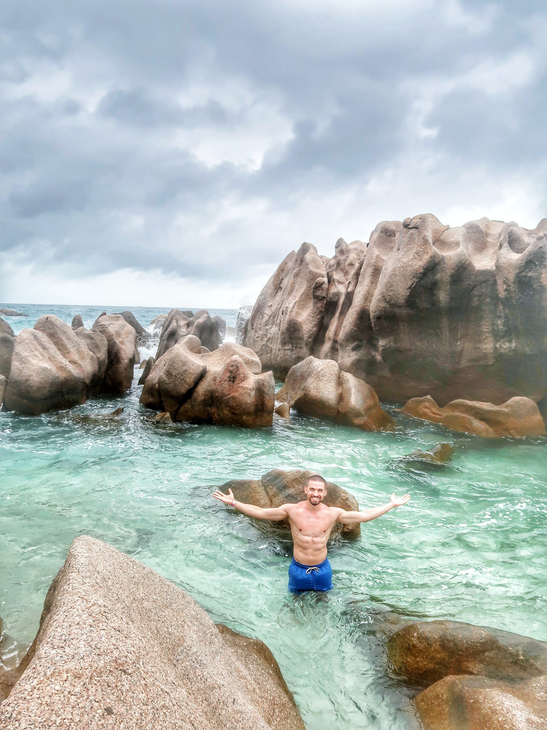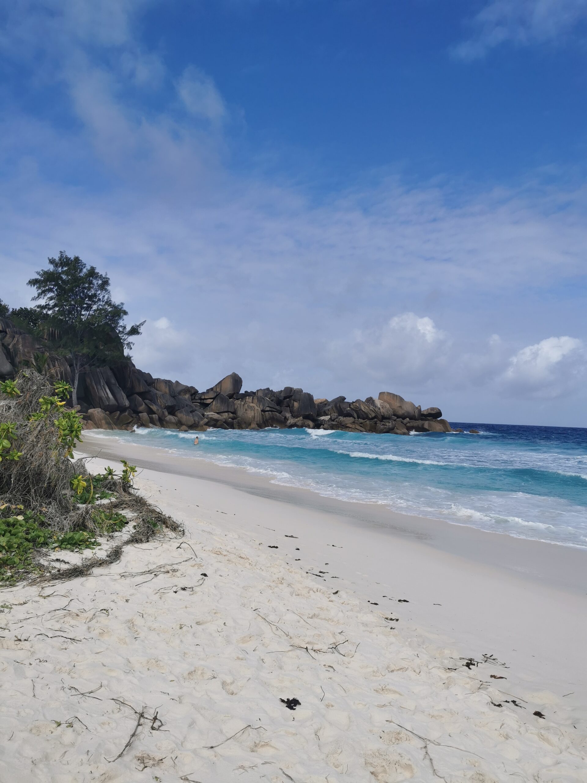 Der Grand Anse Beach ist einer der wenigen erschlossenen Strände auf der Südseite La Digues und für seinen breiten weitläufigen Sandstrand bekannt. Wir persönlich haben den Strand aufgrund seiner Größe genossen, jedoch ist das Schwimmen wegen dem häufig starken Wellengang nicht wirklich zu empfehlen. Michi hat sich trotzdem getraut und ist etwas Wellenreiten gegangen 😀 Hinter dem Sandstrand befinden sich kleine Trampelpfade, über die ihr weitere Strände zu Fuß erreichen könnt. Für einen Beachday ist dieser Küstenabschnitt der perfekte Startpunkt!