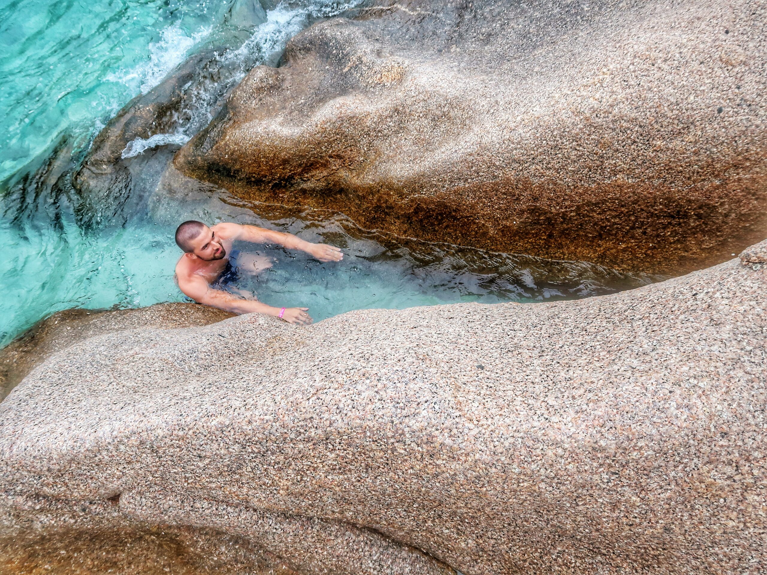 Wenn ihr die Kajaktour gebucht habt, könnt ihr südlich des Robinson Cruseo Strandes einen einzigartigen Naturpool mit privatem Einstieg finden. Wir haben euch die genaue Lage mit Koordinaten markiert, einfach in Google Maps eingeben oder direkt auf unseren Link klicken und los geht die Suche! Den Pool findet ihr hier 4°22'45.0"S 55°49'53.0"E.