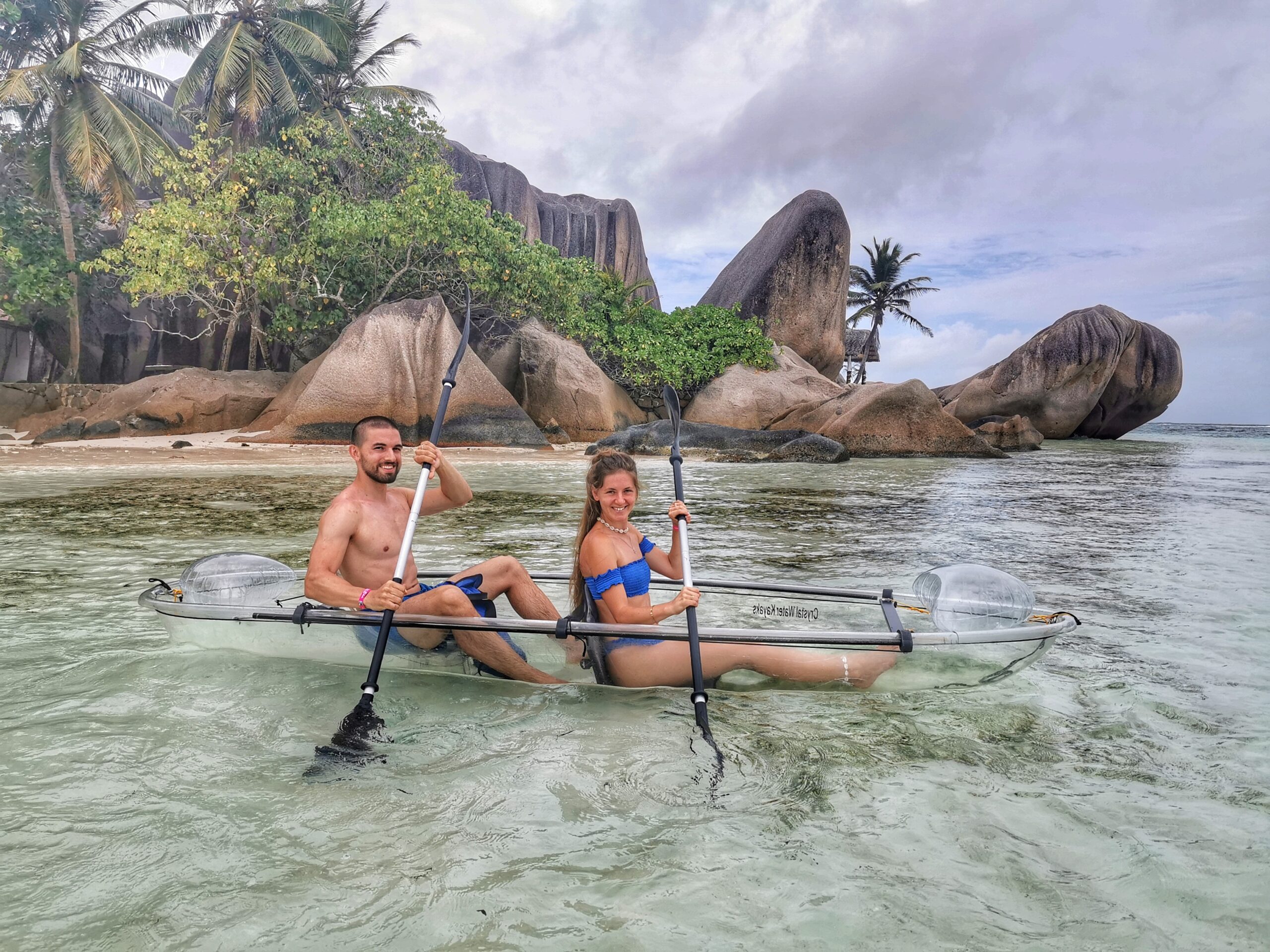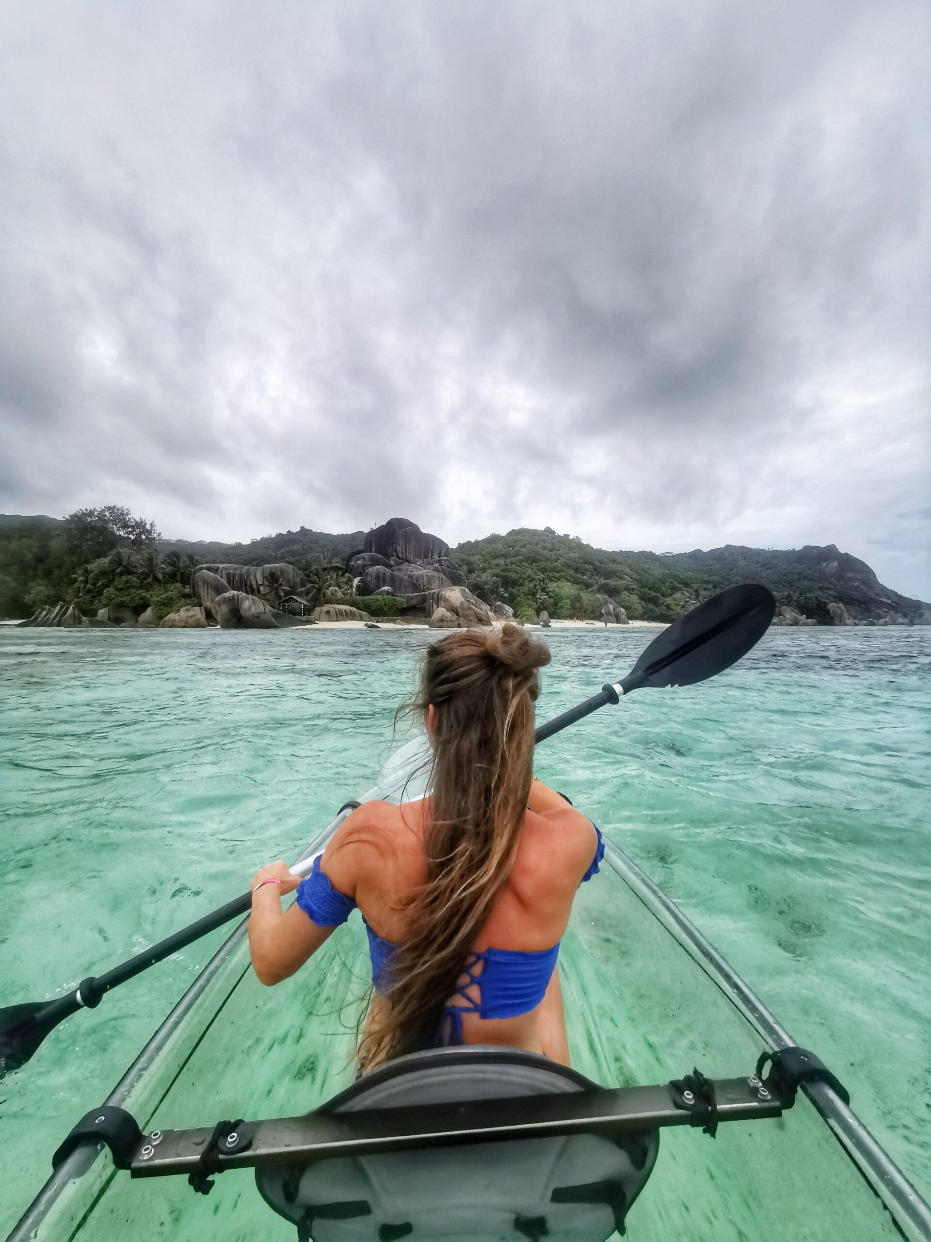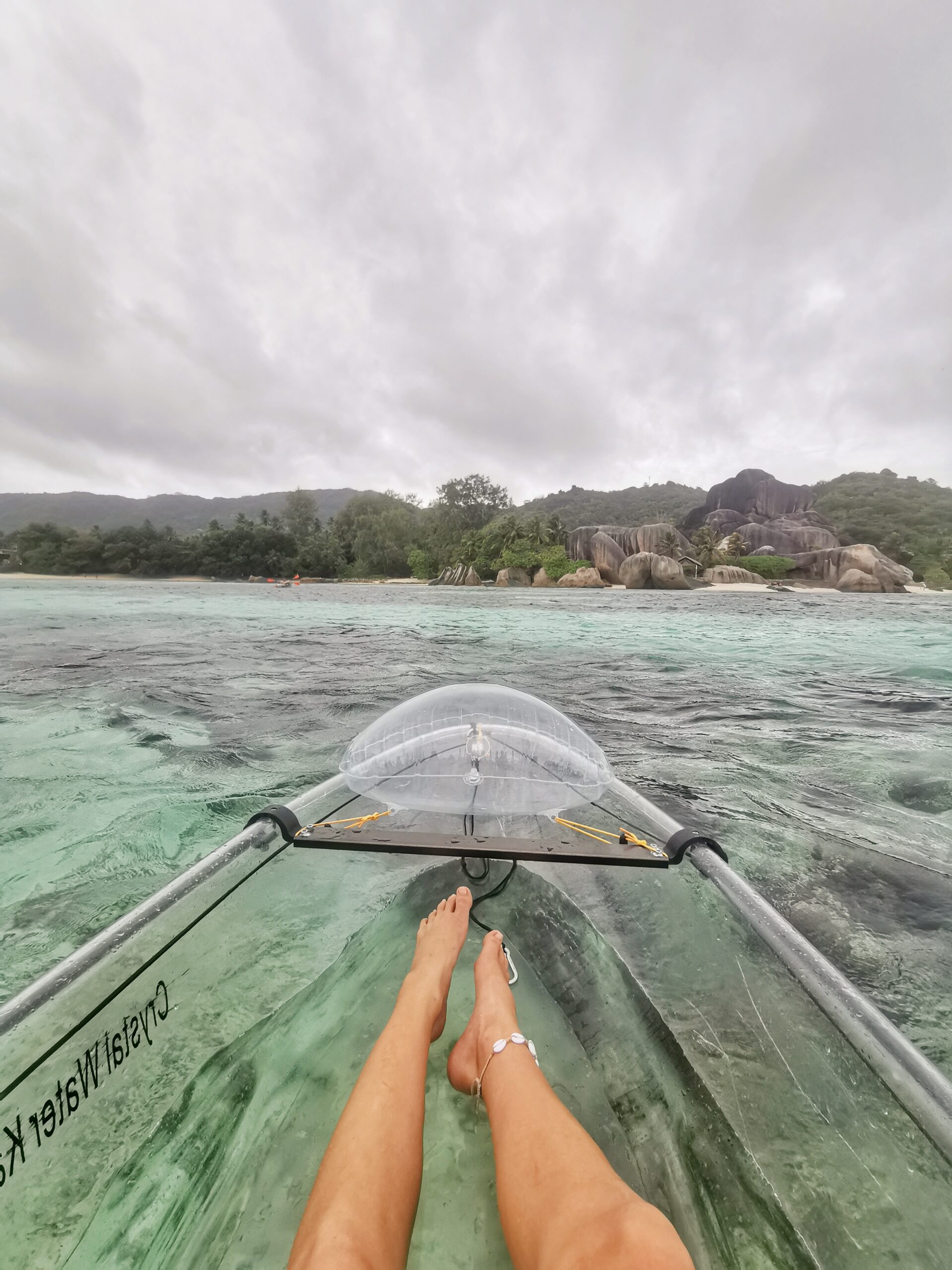 Kennt ihr diese Bilder aus Social Media auf denen Menschen in durchsichtigen Kajaks sitzen und entlang der seychellischen Strände paddeln? Diese besondere Tour haben wir bereits im Vorfeld über den lokalen Anbieter Crystal Water Kayaks gebucht. Nach unserer Tour durch die Vanilleplantage sind wir zum vereinbarten Treffpunkt am Strand gedüst.