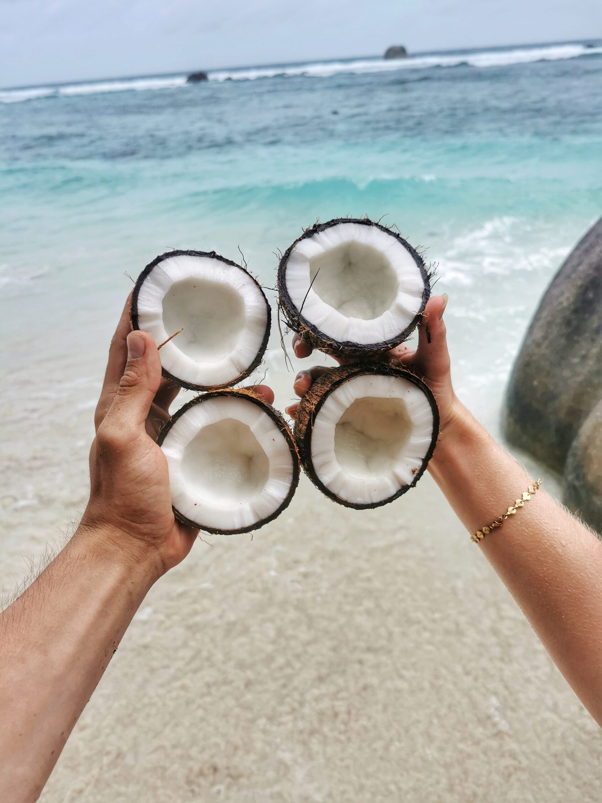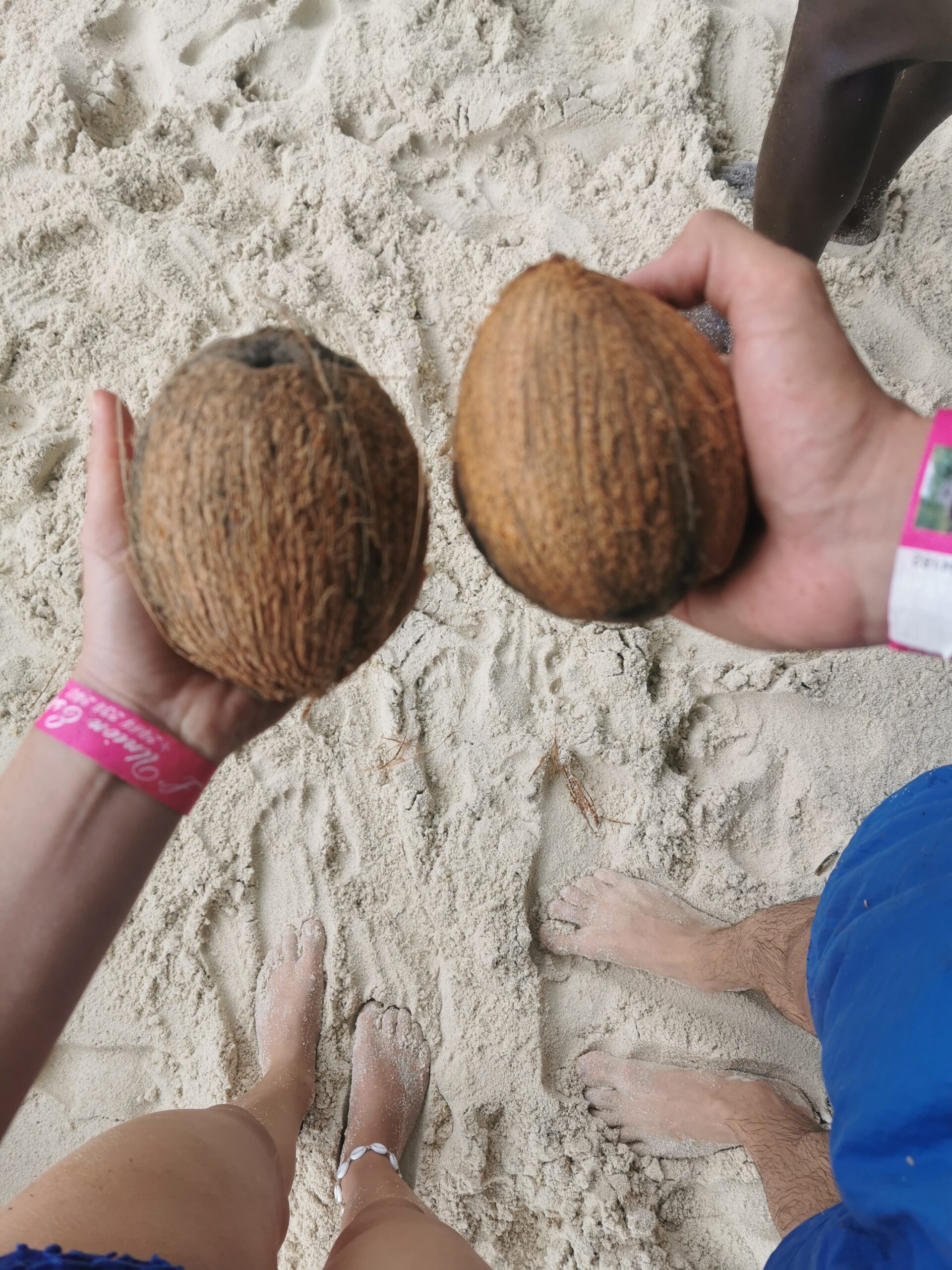 Angelika hat sich sogar besser angestellt als Michi und die Kokosnuss mit nur wenigen präzisen Schlägen geöffnet. Ganz ehrlich: Frische Kokosnüsse auf den Seychellen schmecken anders! Leichter, nussiger und weicher als alles was wir bisher probiert haben, einfach köstlich!