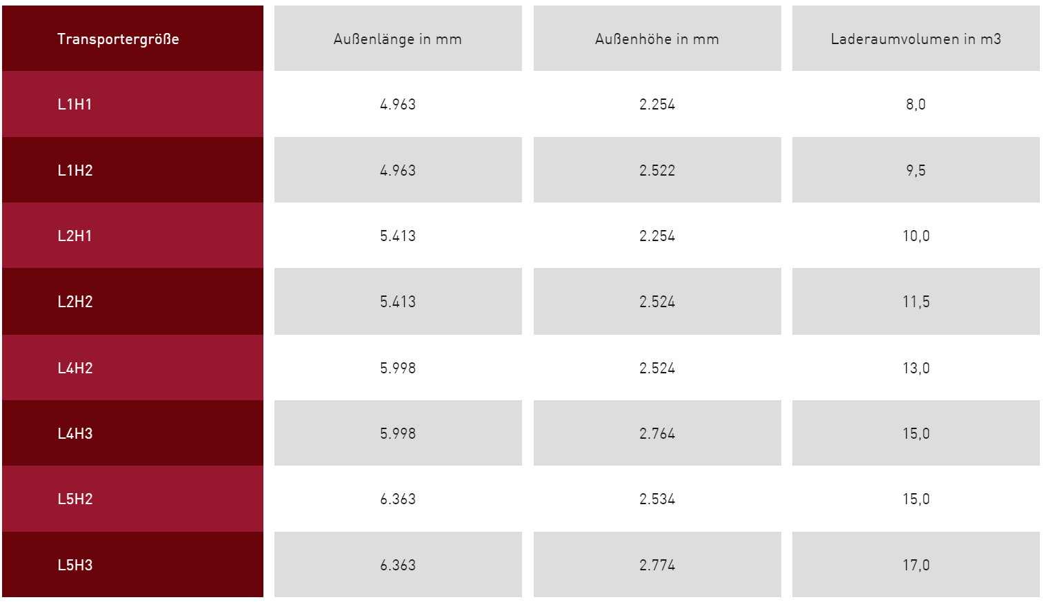Bei der Fahrzeugwahl habt ihr die Auswahl zwischen unterschiedlichen Größen. Aber was bedeutet L1H2 oder L2H2?