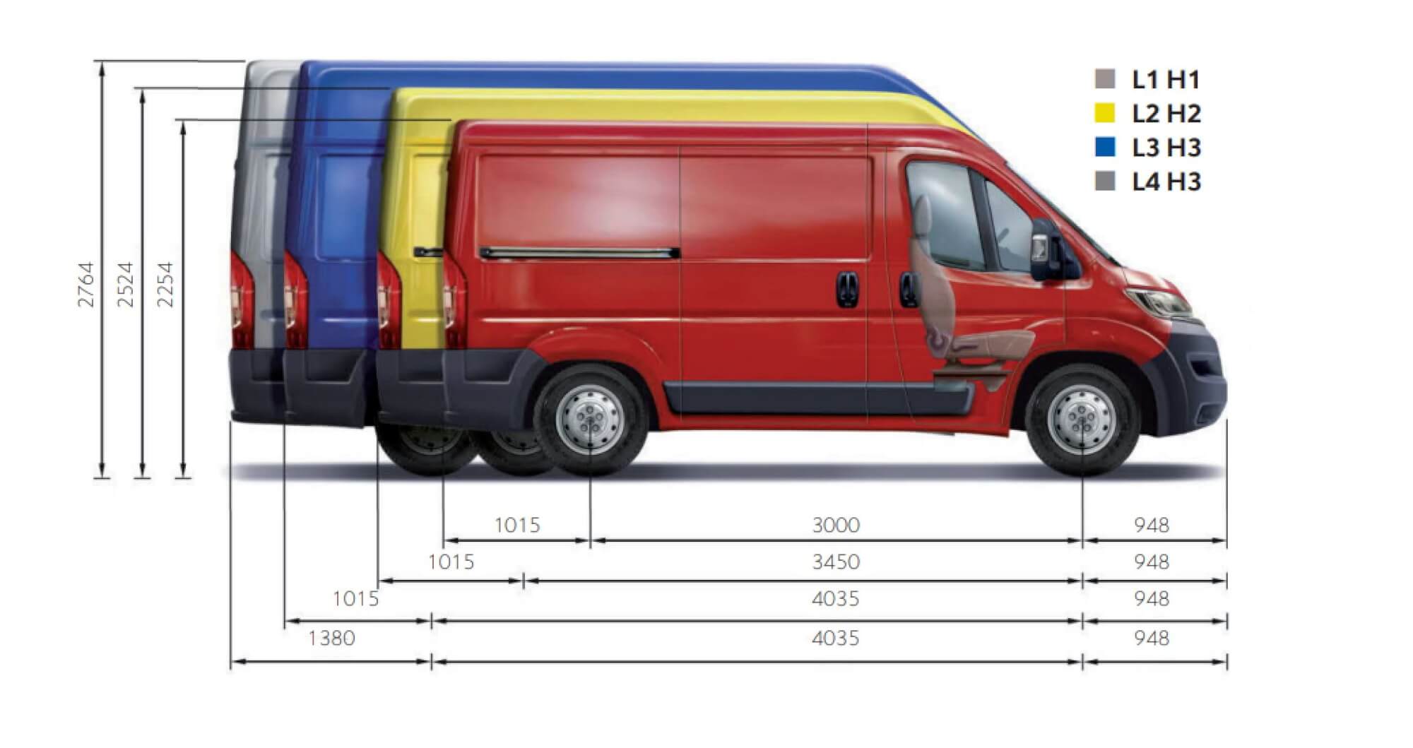 Die Fahrzuggrößen L5 und die Höhen H4 sind weniger häufig zu finden und beziehen sich auf spezielle Fahrzeuge. Die gängigen Kastenwägen sind L2 bis L4 und H2 bis H3.